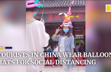 Thursday | May 7 2020A tourist spot in China’s Hunan province provides visitors one-metre long balloon hats for free to remind them of keeping a safe distance from each other when visiting attractions.