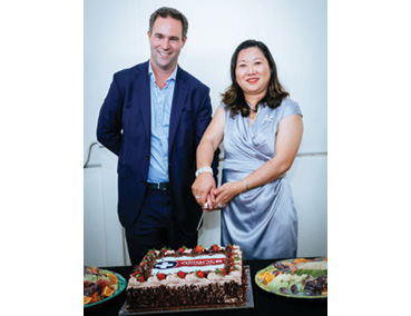 Reynolds is pictured at the opening celebration cutting the cake with Xing Mao from Australian Health Products Central.