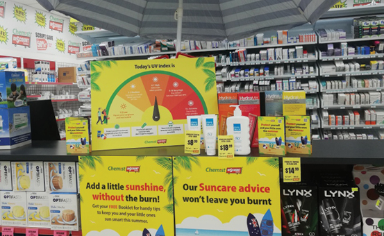 The fun and interactive POS materials - 'How damaging is the sun today?' with a UV index dial where staff can update the UV index each day - should create awareness, CDC concluded. Pictured: CDC Qld Westpoint pharmacy's display.
