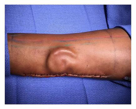 No prosthetics were used to create the appendage (pictured) and it was later successfully transplanted onto the head of the soldier who recovered her hearing.