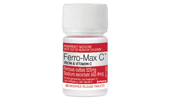 Ferro-Max C is a high potency iron supplement with added Vitamin C to increase iron absorption. Each tablet contains ferrous sulfate 325mg (105mg elemental iron) & vitamin C 500mg.