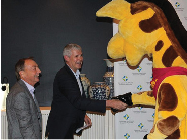 LIFE Education Australia's mascot, Healthy Harold, shook hands with Consumer Healthcare Products Australia (CHP) Chair, Lindsay Forrest, and CEO, Deon Schoombie (pictured), symbolising the new relationship of the two self-care organisations.